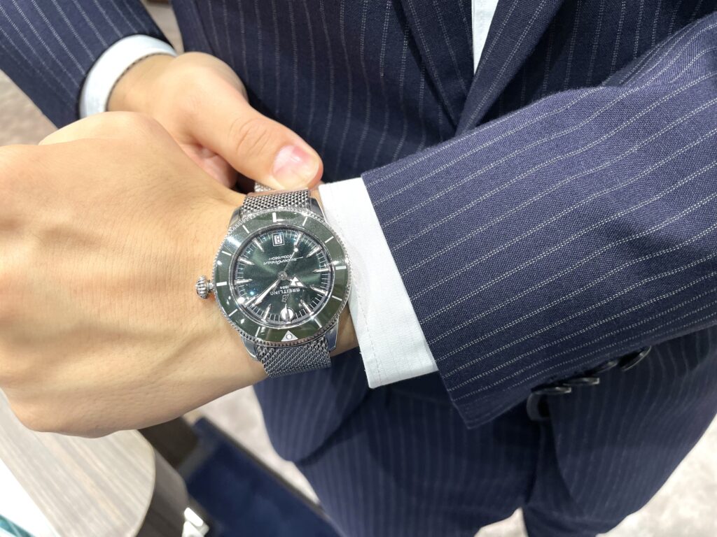 かっこいいですね〜!!!今までにないカラーのこのカーキ!強い緑でなく落ち着いた緑なのでファッションにも合わせやすいですね☺️また以前のスーパーオーシャンヘリテージと変わらず抜群の視認性👀時間が見やすいのももちろんですが羽織りものを使う時期でも圧倒的な存在感は気分が上がりますよね🫶