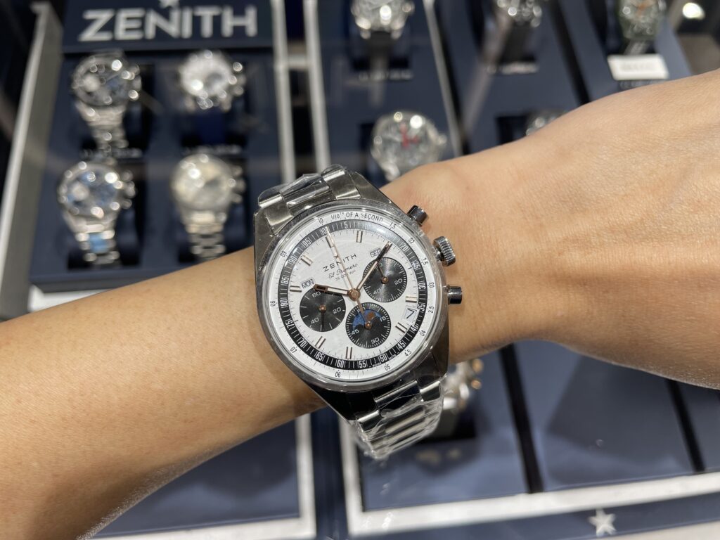ケース径が38mmなので女性のわたしでも着用可能です💪ムーンフェイズがはいると落ち着きとクラシック感を強く感じるのはわたしだけでしょうか?🥹またこの時計に搭載されているエル・プリメロ3610はトリプルカレンダーとムーンフェイズ表示を備えるキャリバーで初めて1/10秒精度の計測を可能にしています😊ここで動画を載せるのも良いかなあと思いましたが、実際に店頭でご覧いただきたいのでやめます!笑 ぜひ店頭でクロノグラフの針の動きをご覧ください👏