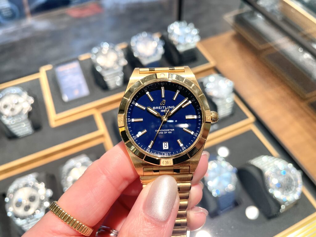 かっこいい~!!18Kイエローゴールドなので重量感もあり時計を着けている!という嬉しい重みですね☺個人的にこの文字盤の深いネイビーがとってもオシャレで上品さを感じます。写真で見るよりもっと深いネイビーですのでぜひ店頭でご覧いただきたいです!限定品であり、今回フェア期間に特別に用意したものですのでお急ぎくださいね~!