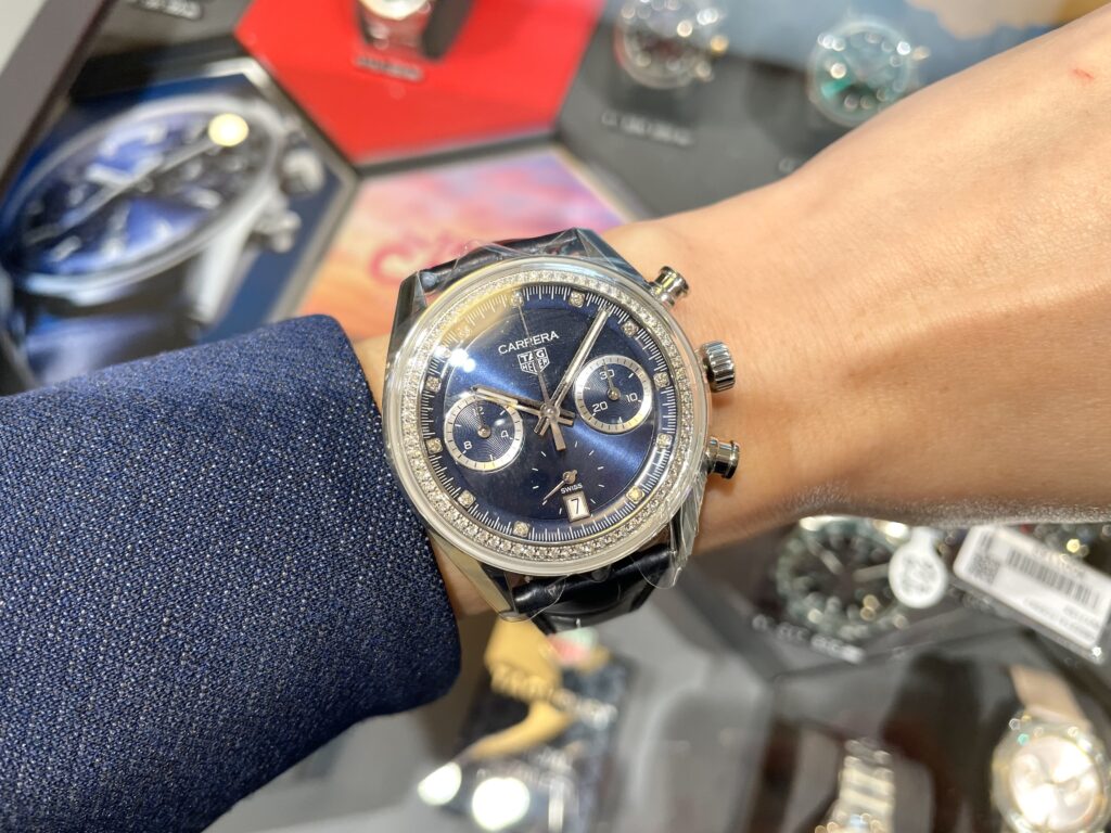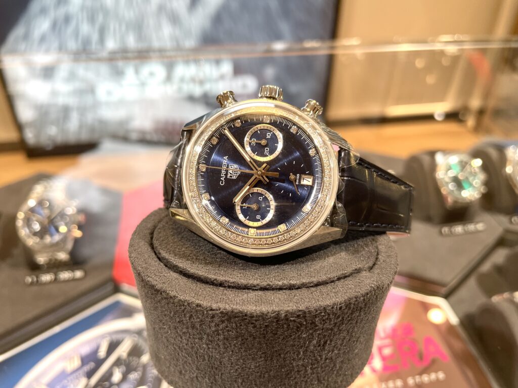 なんともゴージャス!!他にもカレラクロノグラフの39mmはあるのですがこちらはベルトが細くなっておりどちらかといえば女性をメインに作られているのではないかと感じました。大きさは同じなのにベルトが違うだけで着用感はかなり変わりますね🌞他にもお色違いのパウダーピンクのご用意もございますのでぜひ店頭で着用し比べてみてください!