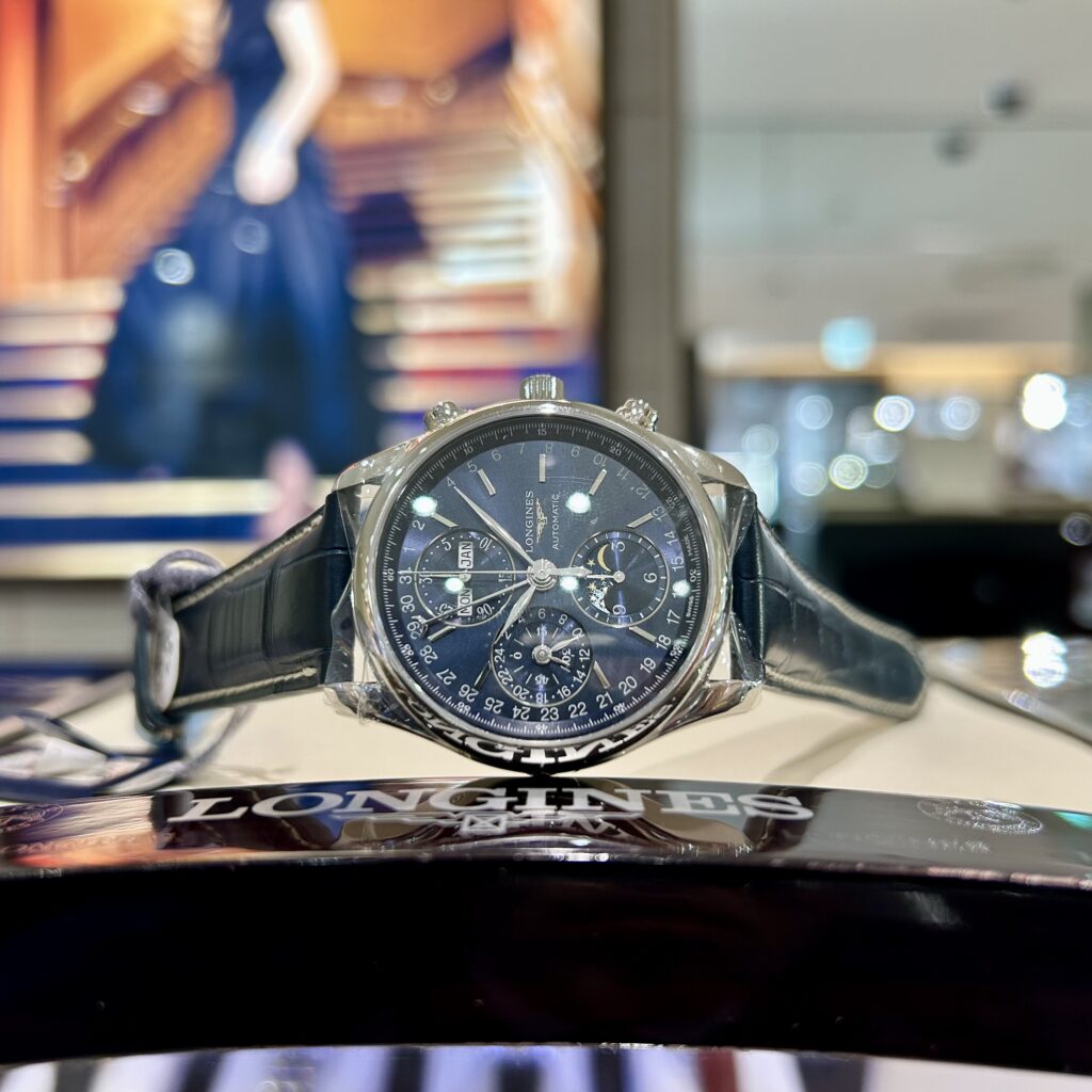 クロノグラフ機能に加え、6時位置にはムーンフェイズ、12時位置に月、曜日が表示され、