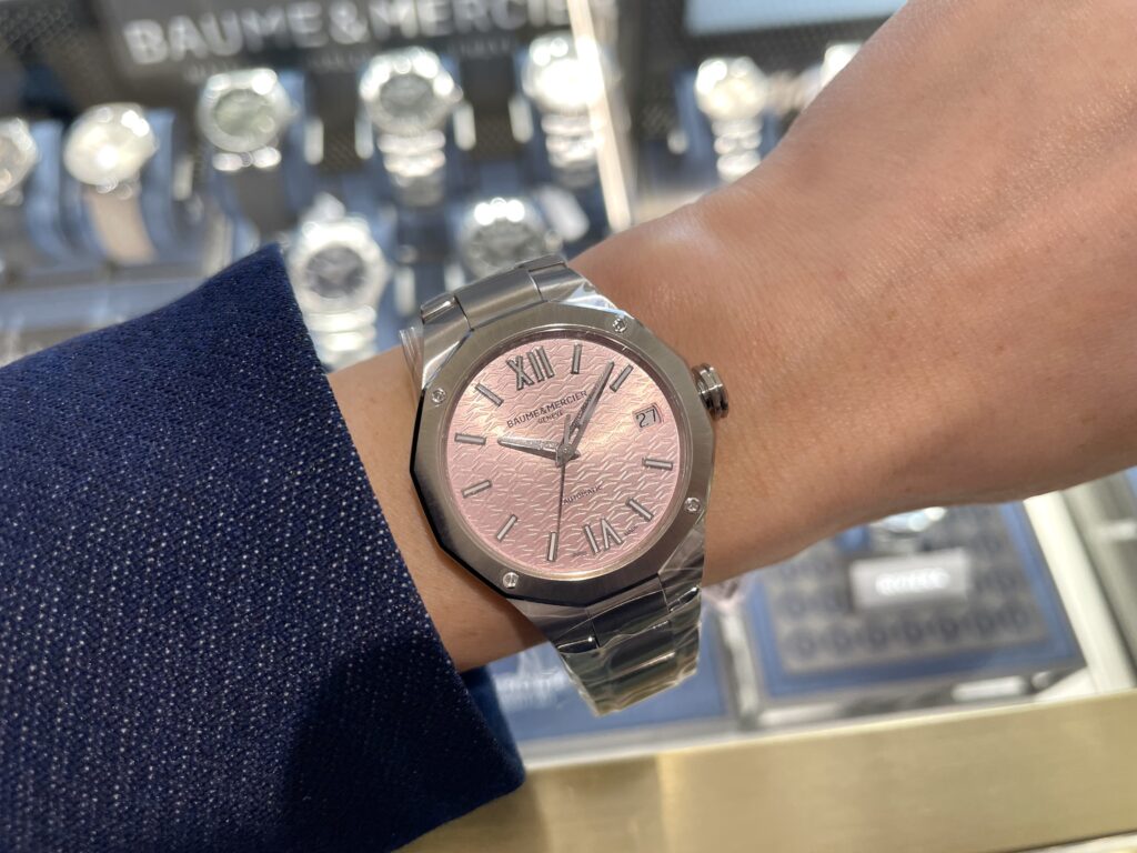 このピンク、可愛いですよね〜!ピンクの“サンレイ・サテン仕上げ”の新しい33mmのレディスのリビエラは、女性らしさ、上品なスタイル、自然体といった本質を大切にしてます👩✨そしてエレガントでスポーティな顔も併せ持つ!本格的ですよね😊