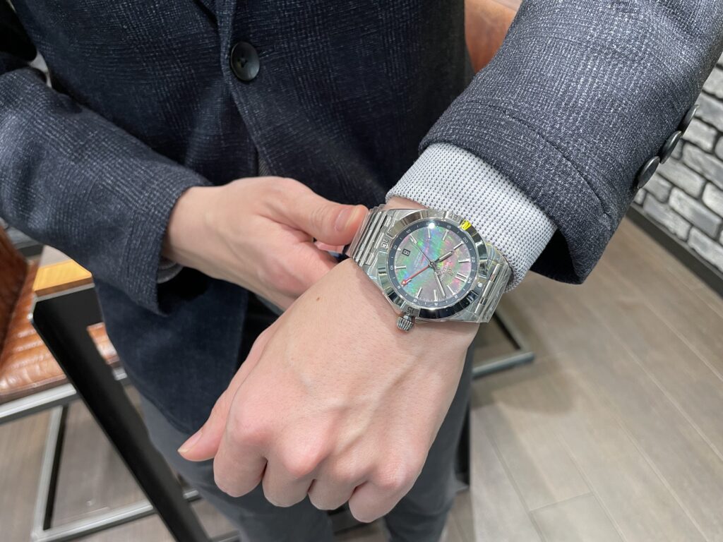 40mmなのでサラッと着けこなせる大きさですね👀💫スーツにはもちろん、暖かくなってくるこれからの季節ファッションポイントにもピッタリではないでしょうか??このシェルの文字盤は売り場でも一際目立っている存在です☺️この輝き…ずっとみていたいですよね🥹🥹!!