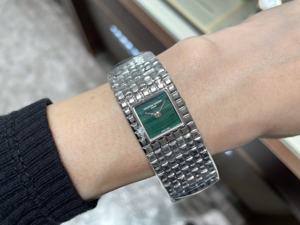 マンシェットとは仏語で袖口のことを言います。名前の通りクラシックマンシェットは袖口で時を知らせるブレスレットです✨マラカイトの深い緑色と繊細な縞模様が文字盤を艶やかに彩ってくれます☺️そしてマラカイトとは濃淡の緑色が美しい縞模様を描く銅を主成分とする炭酸塩鉱物で、孔雀の羽に似た模様から「孔雀石(くじゃくいし)」と呼ばれ、古代エジプトではアイシャドウ、現代ではパワーストーンとして、洞察力を高めたり、危険やストレスから身を守る石として扱われているそうです🙂↕️いつでも身につけておきたいなと思いませんか?