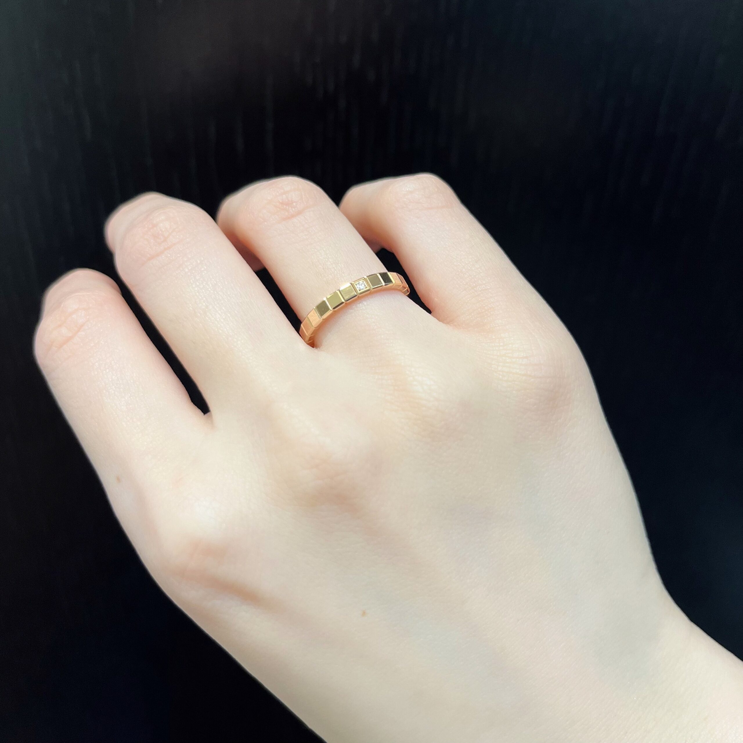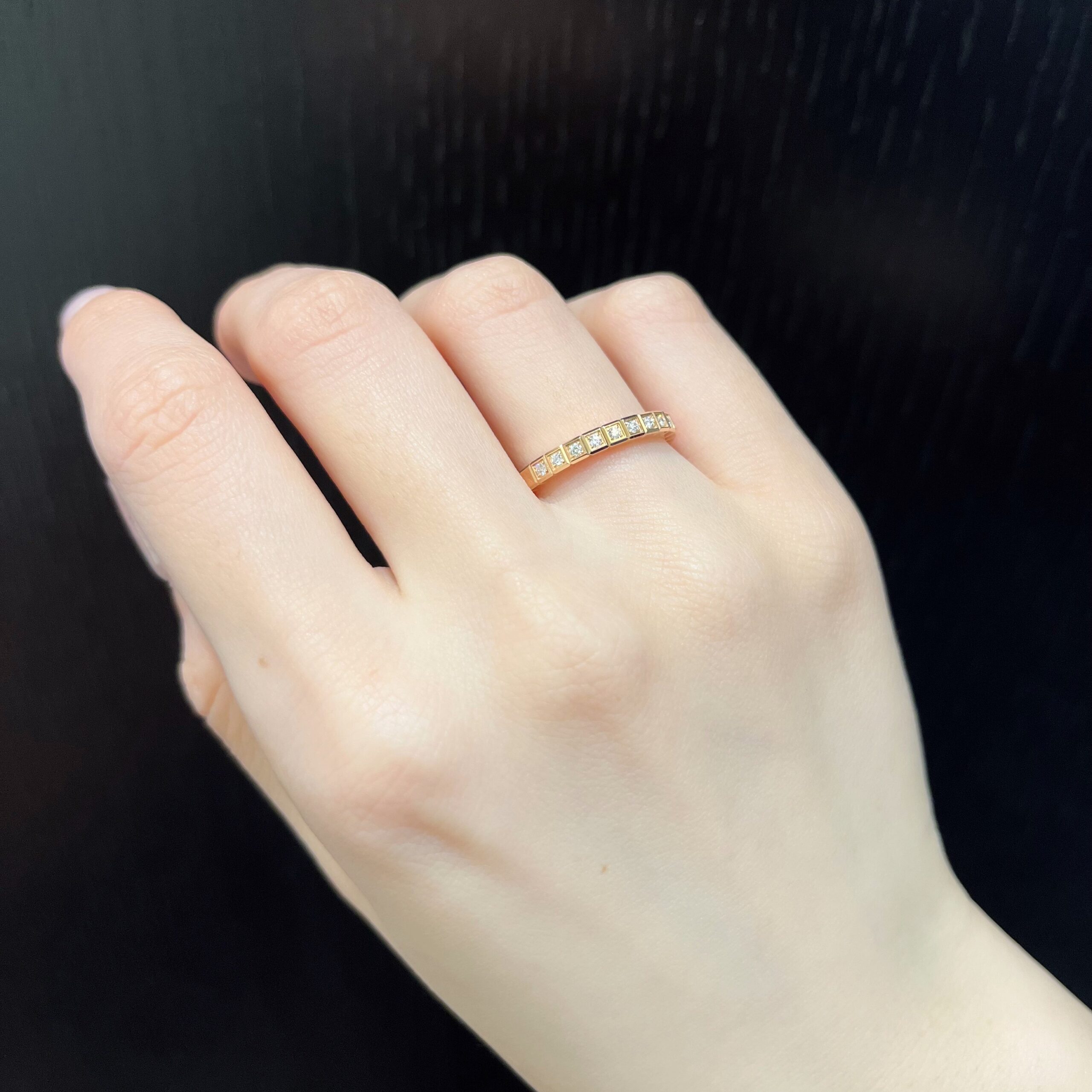 こちらのハーフエタニティは、キューブで囲われたダイヤモンドの輝きを思いっきり楽しめるエレガントなモデルです。