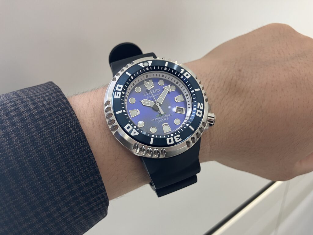 回転ベゼルは夜光を施したUNITE with BLUEの特別仕様で、