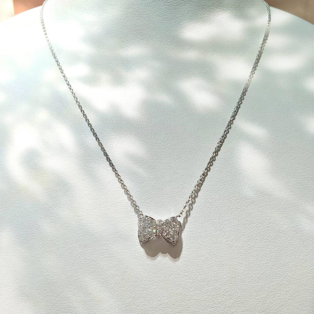 中央にあしらわれたリボンは、可愛らしさとエレガンスを両立する絶妙なデザイン。丸みのあるフォルムとダイヤモンドの輝きが調和し、まるで胸元に小さな光の花束を添えたよう。