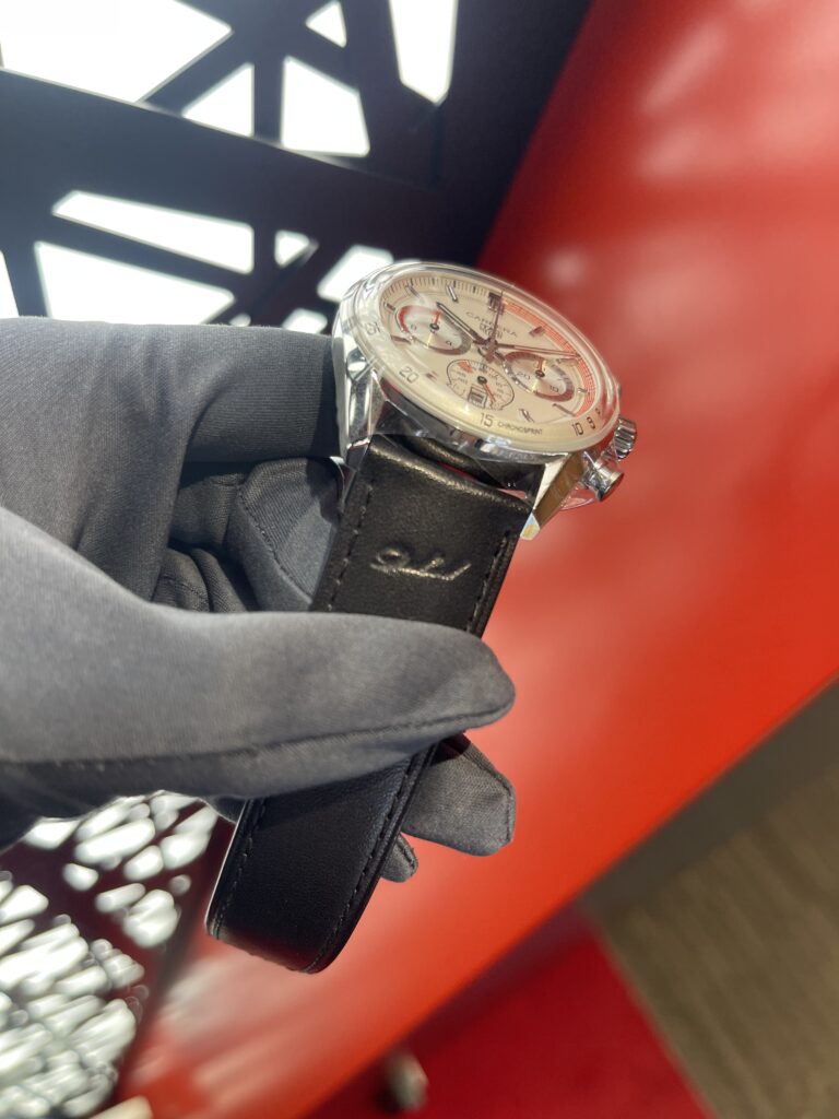 文字盤は、落ち着いた白文字盤に赤を組み合わせ、上手くスピード感を表現しています。