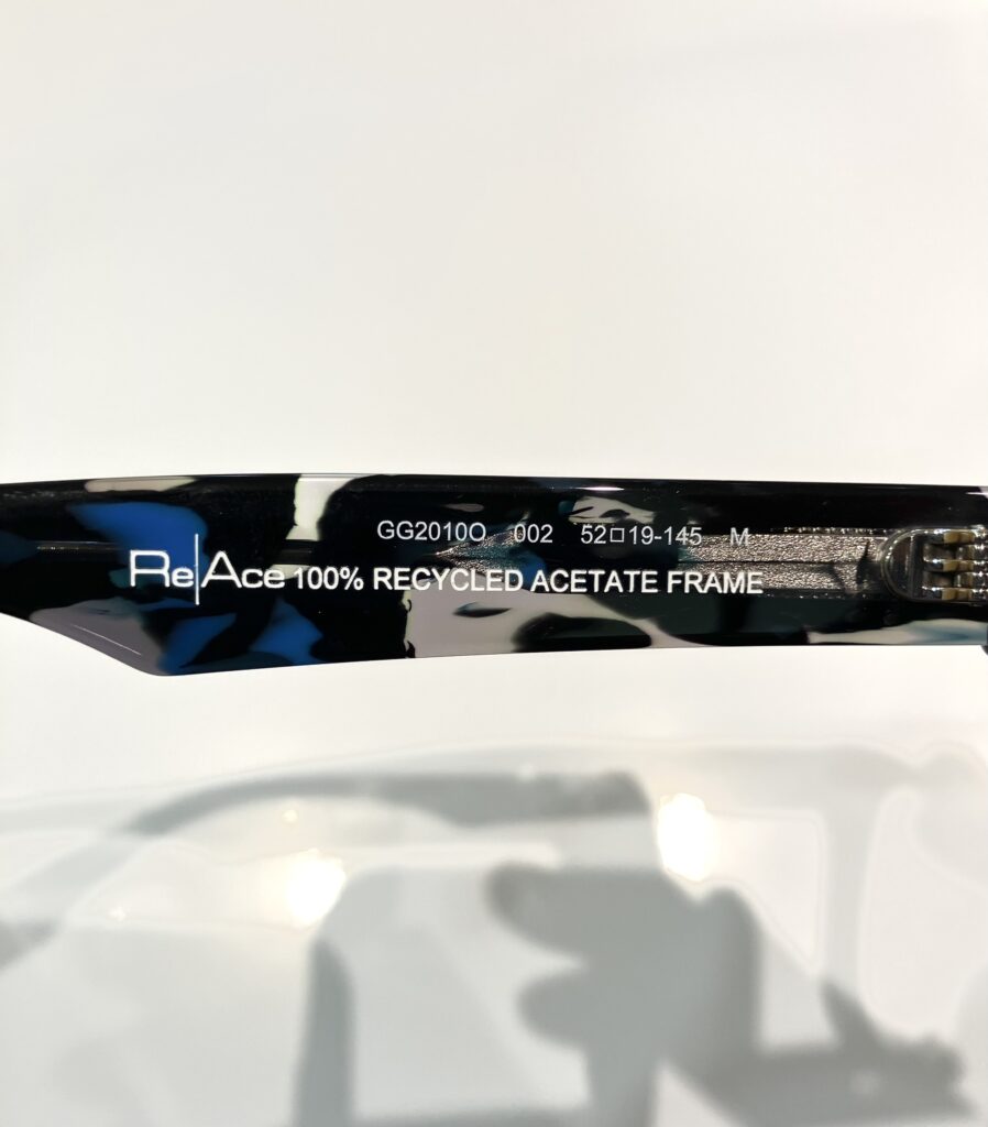 リサイクルアセテート素材のフレームには上記写真のような刻印が施されています。