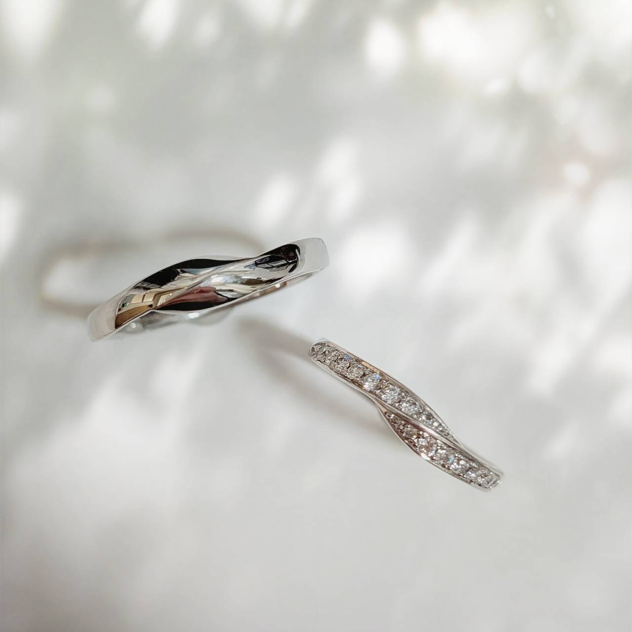 女性用は、ダイヤモンドを贅沢にあしらったハーフエタニティリング。