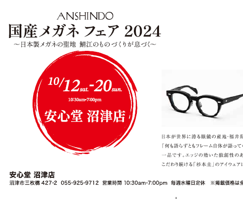 【10/12~10/20】国産メガネフェアを開催します【安心堂沼津店】