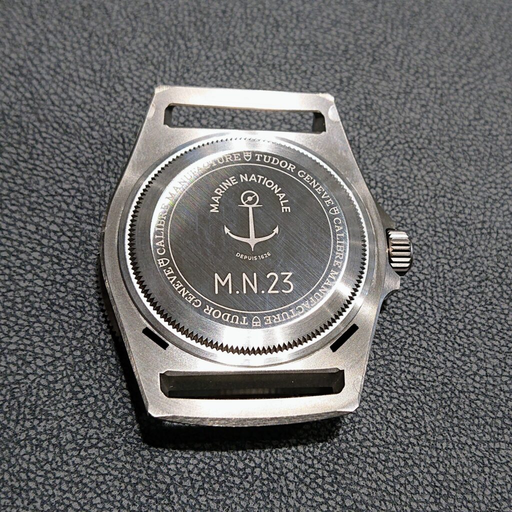 裏蓋はステンレススティール製となっており、碇マークの仏海軍のロゴが刻印されており、Marine Nationale 2023(数字は製造年を示すため、毎年変わります)のエングレーブが入っております!