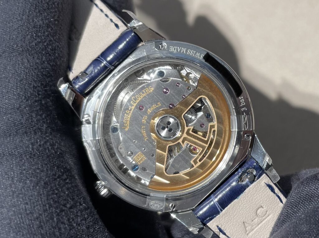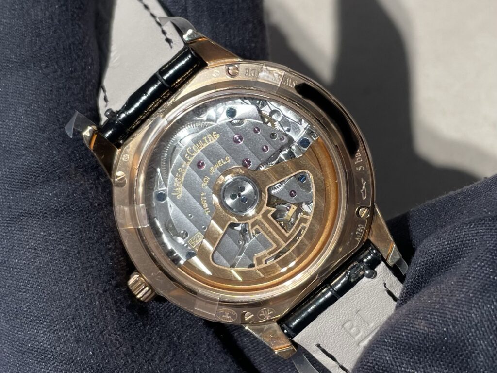 裏面は自動巻きムーブメントが見える仕様。ムーブメントのパーツひとつひとつも丁寧に磨き込まれており、ジャガールクルトならではのこだわり抜いた美しいムーブメントとなります。
