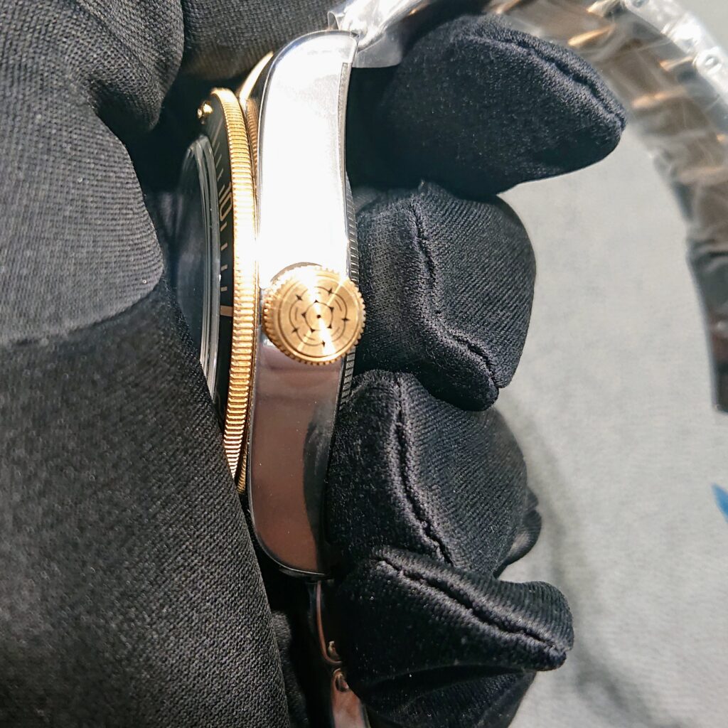 リューズはイエローゴールド製のスクリュー式になっており、