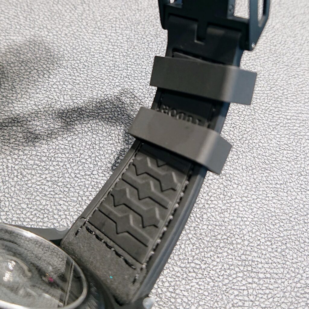 ベルトはレザーとラバーライニングによるハイブリッドストラップのため、