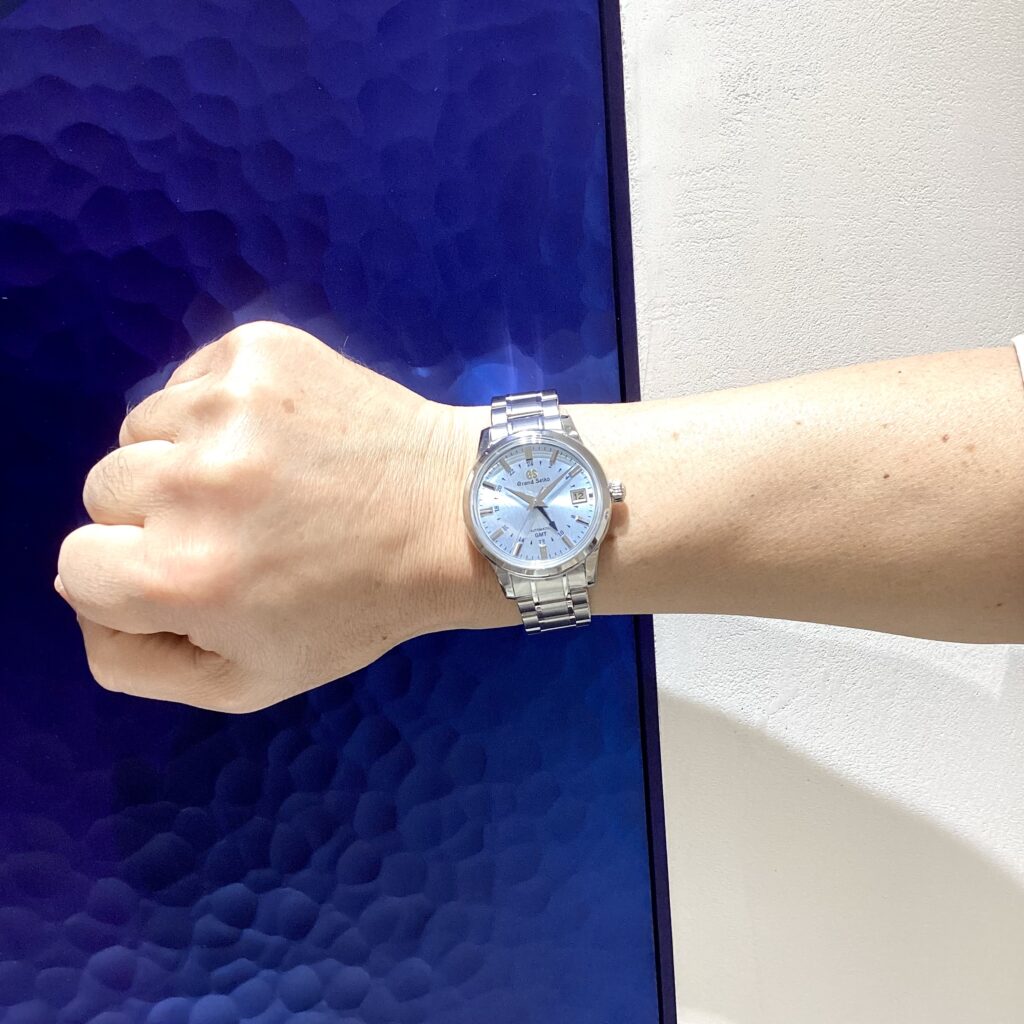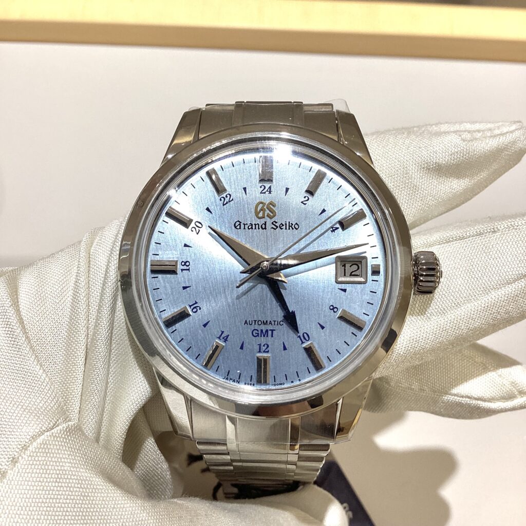 ブルースチールのGMT針がスカイブルーの文字盤に映えます。