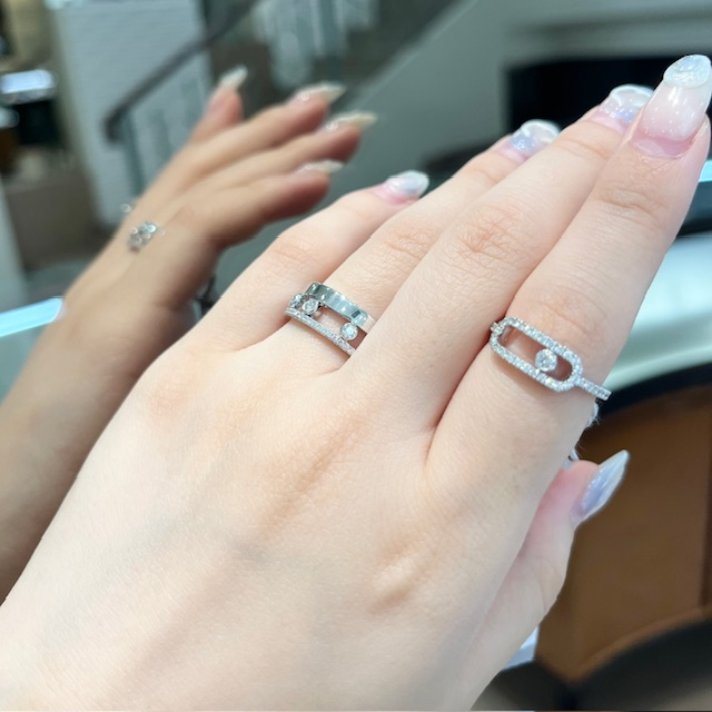 人差し指ののムーヴ ウノというダイヤ1石のリングと…