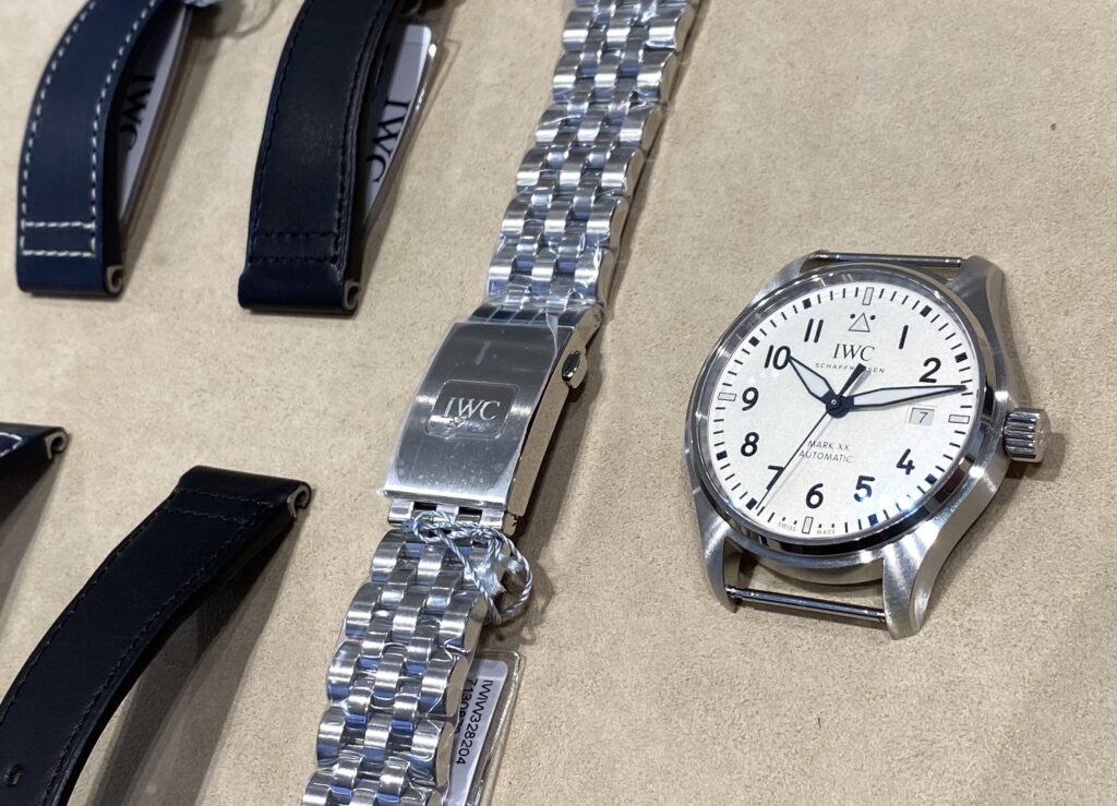 白文字盤ですと標準は黒の革ベルトですが、IWC純正の「EasX-CHANGE」のベルトに自在に組み合わせが可能です。
