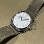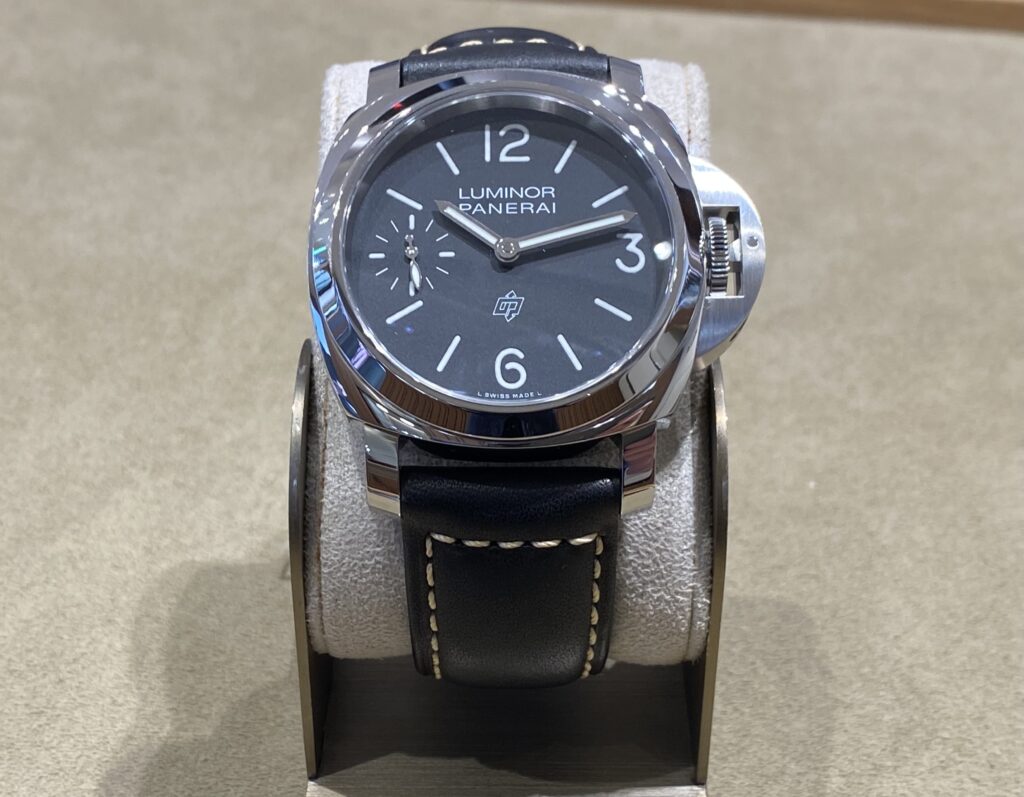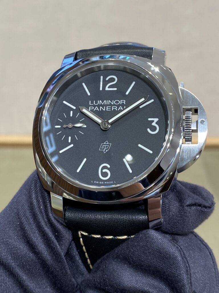 6時位置にはパネライの正式名称「OFFICINE PANERAI」の「O」と「P」を組み合わせたロゴが配されている数少ないモデルです。
